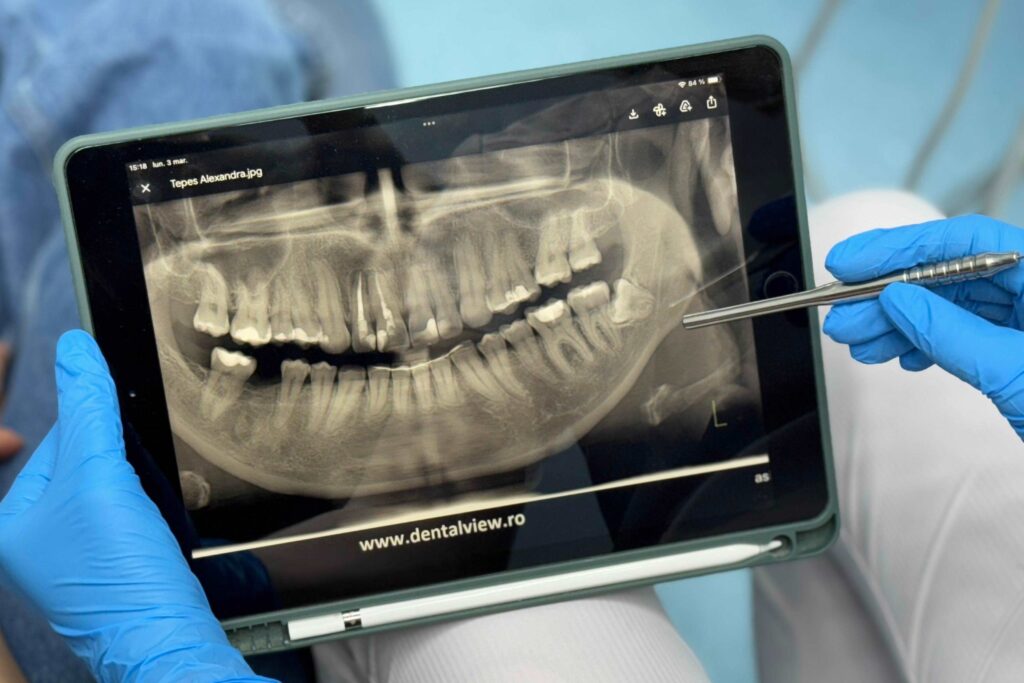 CE SE INTAMPLA: Pe baza radiografiilor sau a tomografiilor se alege tipul de implant dentar, numărul și poziția la nivelul osului